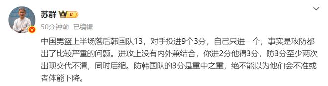 对此,苏群第一时间点评了比赛,表示:“中国男篮上半场落后韩国队13,对手投进9个3分,自己只进一个,事实是攻防都出了比较严重的问题。进攻上没有内外兼结合,你进2分他得3分,防3分至少两次出现交代不清,同时后缩。防韩国队的3分是重中之重,绝不能以为他们会不准或者体能下降。