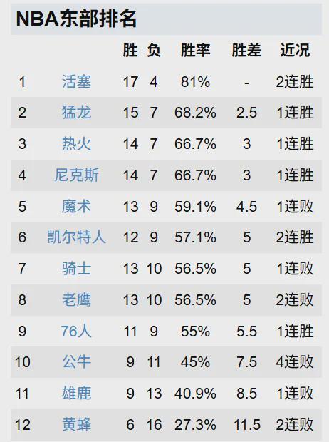 雄鹿的战绩也开始大跳水,今天赛前是9胜13负,仅仅排在东部第11,近10场比赛只有2胜8负。
