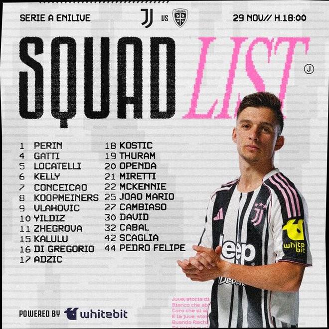 北京时间11月29日,尤文官方公布主场战卡利亚里大名单,伊尔迪兹领衔,加蒂回归。